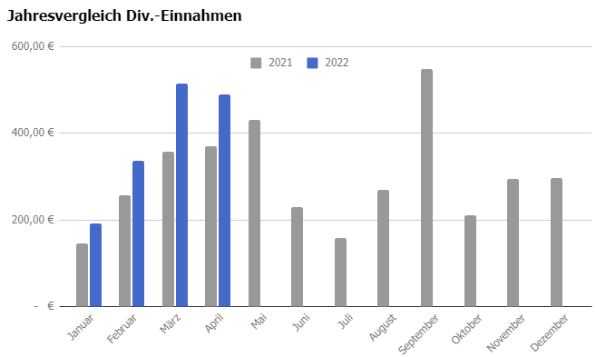Es wird im Mai zum ersten Mal eine Ausschüttung von der neuen AT & T geben. Da diese deutlich unter dem Vorjahr ausfallen wird, gehe ich von keiner großen Steigerung im Mai gegenüber dem Mai 2021 aus.