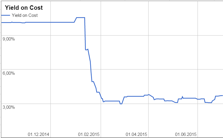 Auch die Entwicklung der Dividende zu Beginn des 2. Quartals, stimmte mich sehr freudig. So ist selbst ohne Erhöhung selbiger, die Dividende von Reynolds dank Währtungseffekten um über 10% gestiegen. Auch die weiteren Zahlungen dieses Quartales waren sehr erfreulich. Nachdem ich im 1. Quartal 256,57 € an Einnahmen zu verzeichnen hatte, stiegen diese im 2. Quartal auf 463,03 €. Dies hat im großen und ganzen mit den Dividenden aus Deutschland zu tun. Diese haben 224,00 € ausgemacht, nachdem es im 1. Quartal ~ 117,00 € waren die auf Einmalausschüttungen fußten. Es waren also trotzdem eine deutliche Steigerung zu sehen. Insgesamt stehen per 30.06. Einnahmen aus Ausschüttungen in Höhe von 719,60 €. Dies finde ich sehr erfreulichen. Beim Yield on Cost liege ich trotz einiger Werte ohne Ausschüttung bei 3,69 %. Dies ist mehr als es auf Festgeld & Co gibt.