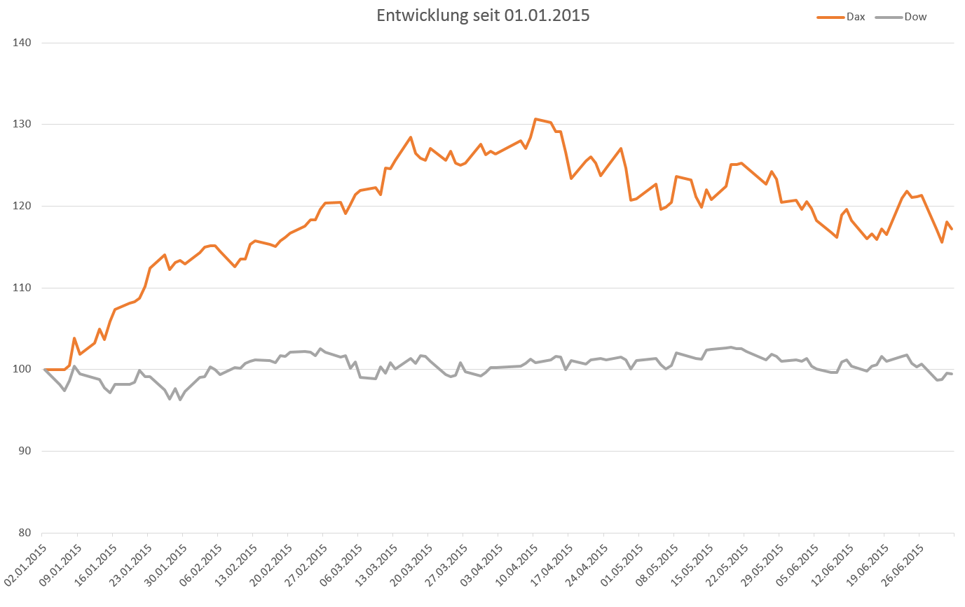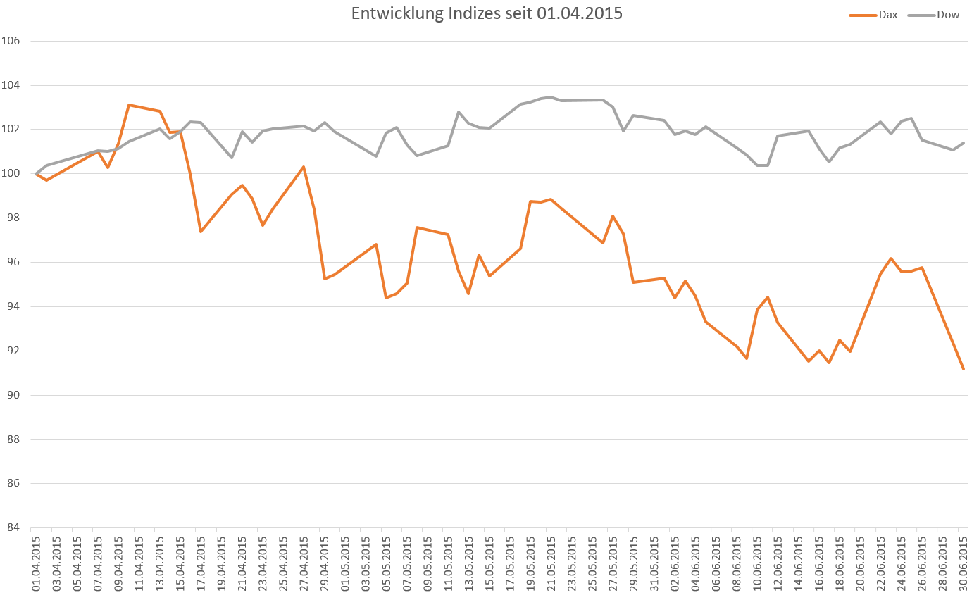 Die Griechenland – Krise war das allumfassende Thema das 2. Quartals. Es verging kaum ein Tag, an dem nicht davon die Rede war oder sich in Brüssel die Finanzminister mit den Regierungschefs die Klinke in die Hand gaben. Seit dem 27.06. steht nun fest, das die Griechen einen Referendum über die Reformvorhaben abhalten wollen und die Verhandlungen mit der Eurogruppe abbrachen. Das letzte Wochenende war geprägt von fast allem, was man nach so einer überraschenden Ankündigung erwarten konnte. Die Banken gaben ab Montag nur noch 60€ an den Automaten aus und hatten ansonsten geschlossen. Alles wartet nun auf den Sonntag und blickt gespannt nach Athen.
