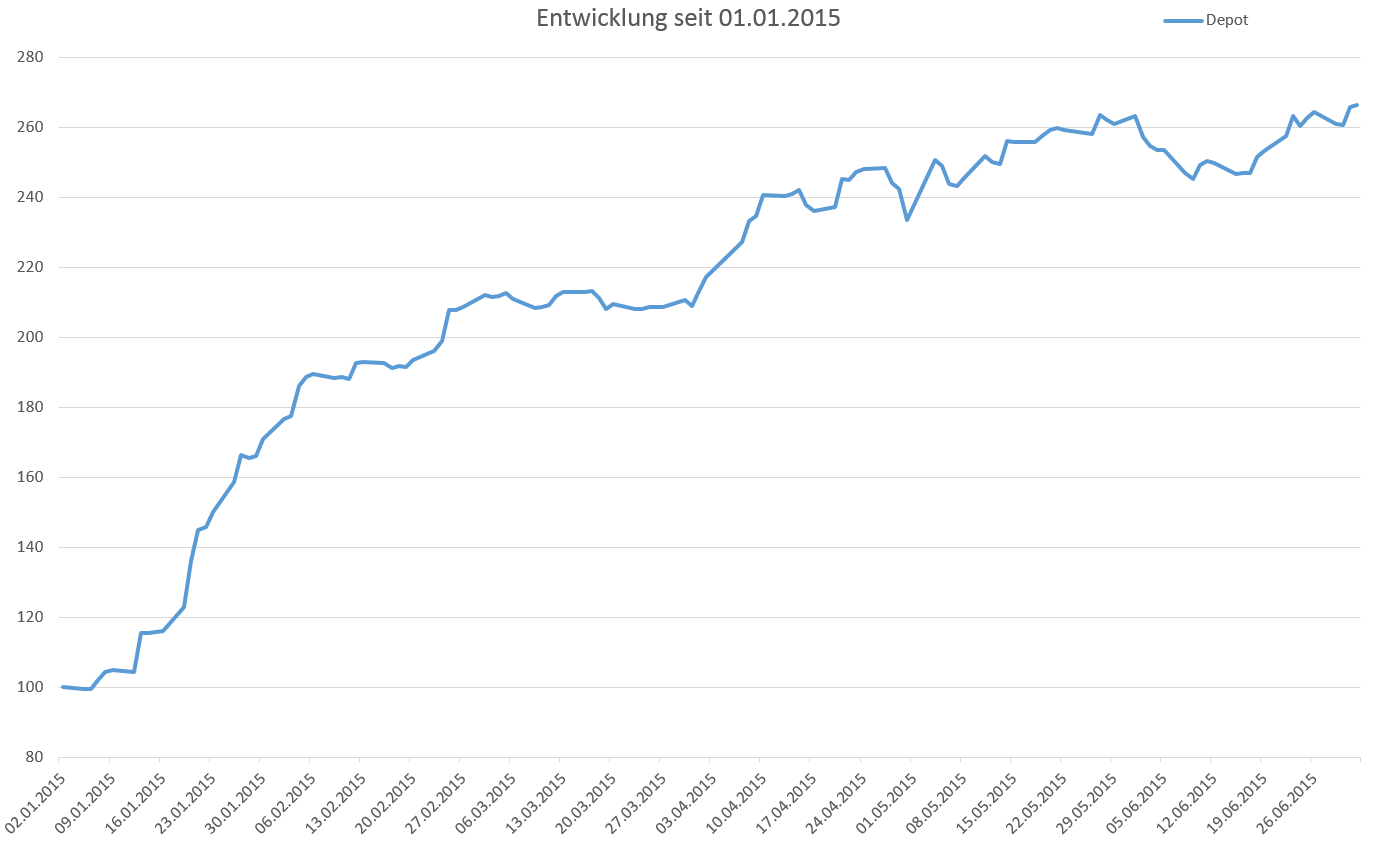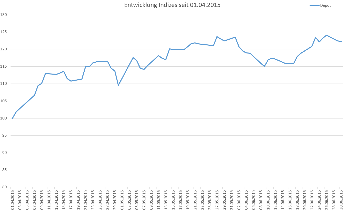 Die Aktienmärkte legten nach den ersten 3 Monaten, welche sehr stark waren eine kleine Pause ein. Auch die Entwicklung des Euro gegenüber dem Dollar verlief nicht mehr ganz so schnell nach unten und stabilisierte sich in den letzen Woche bei 1,11 €. Der Dax büßte seit seinem Frühlingshoch rund 1000 Punkte ein. Dies ging nicht ganz spurlos an meinem Depot vorbei, auch wenn ich 2 Titel habe die dank Übernahmefantasie deutlich an Wert zulegten konnten. Das Depot verzeichnete Ende des 1. Quartals einen Wert von 30.900 € und am Ende des 2. Quartals von 38.600 €, was einem Wertzuwachs von fast 25 % entspricht. Dies kommt aber fast ausschliesslich aus den Zukäufen, da diese im 2. Quartal bei 9.300 € lagen. Dies zeigt das auch mein Depot an Wert verloren hätte.